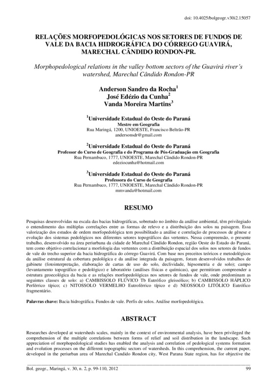 Pesquisas desenvolvidas na escala das bacias hidrográficas, sobretudo no âmbito da análise ambiental, têm privilegiado o entendimento das múltiplas correlações entre as formas de relevo e a distribuição dos solos na paisagem. Essa valorização dos estudos de ordem morfopedológica tem possibilitado a análise e correlação de processos de gênese e evolução dos sistemas pedológicos nos diferentes setores topográficos das vertentes. Nessa compreensão, o presente trabalho, desenvolvido na área periurbana da cidade de Marechal Cândido Rondon, região Oeste do Estado do Paraná, tem como objetivo correlacionar a morfologia das vertentes com a distribuição espacial dos solos nos setores de fundos de vale do trecho superior da bacia hidrográfica do córrego Guavirá. Com base nos preceitos teóricos e metodológicos da análise estrutural da cobertura pedológica e da análise integrada da paisagem, foram desenvolvidos trabalhos de gabinete (fotointerpretação, elaboração de cartas de uso do solo, declividade, hipsometria e de solo); campo (levantamento topográfico e pedológico) e laboratório (análises físicas e químicas), que permitiram compreender a estrutura geoecológica da bacia e as relações morfopedológicas nos setores de fundos de vale, onde predominam as seguintes classes de solo: a) CAMBISSOLO FLÚVICO Tb Eutrófico gleissólico; b) CAMBISSOLO HÁPLICO Perférrico típico; c) NITOSSOLO VERMELHO Eutroférrico típico e d) NEOSSOLO LITÓLICO Eutrófico fragmentário.