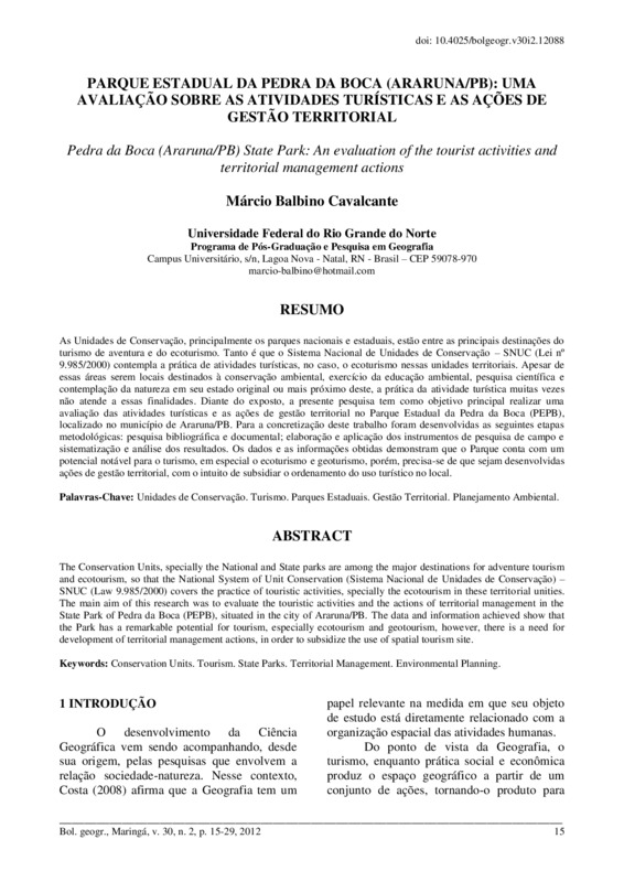 Parque Estadual da Pedra da Boca (Araruna/PB): uma avaliação sobre as atividades turísticas e as ações de gestão territorial - doi: 10.4025/bolgeogr.v30i2.12088