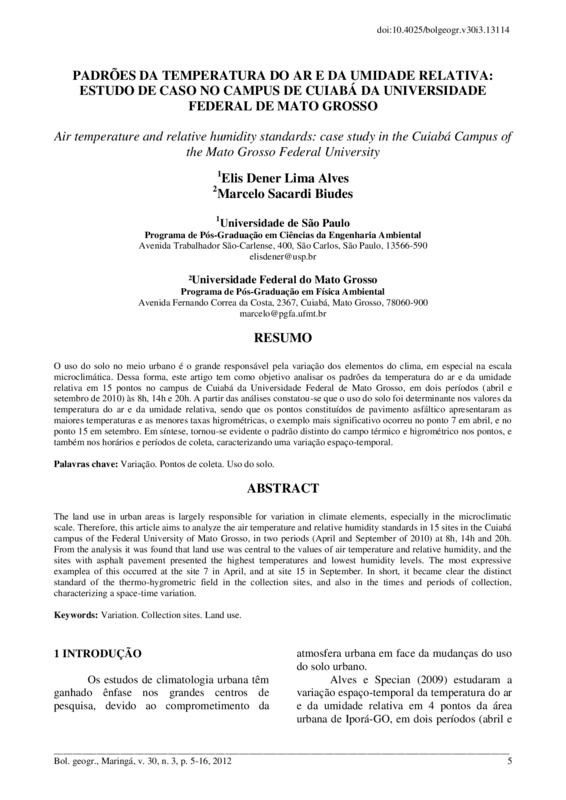 Padrões da temperatura do ar e da umidade relativa: estudo de caso no campus de Cuiabá da Universidade Federal de Mato Grosso - doi: 10.4025/bolgeogr.v30i3.13114