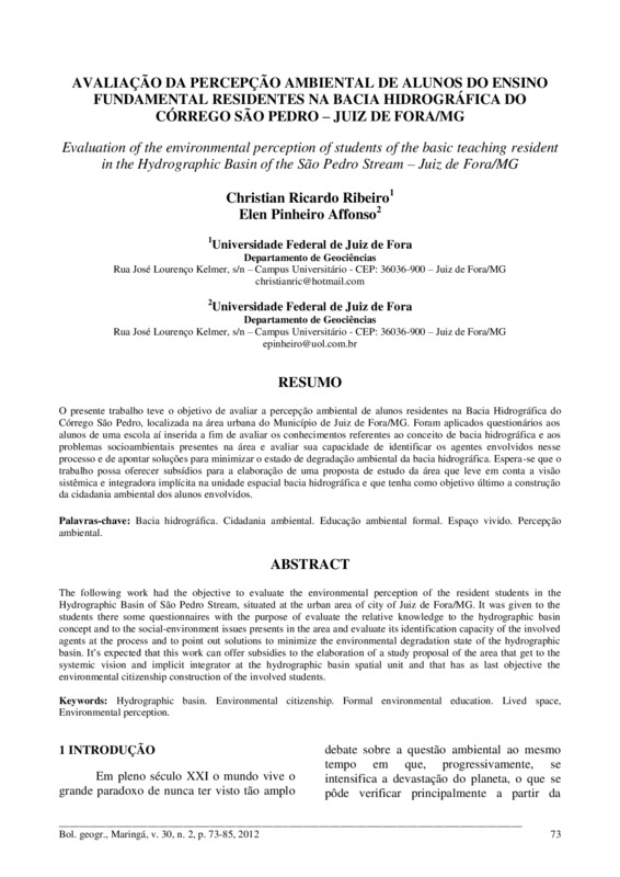 Avaliação da percepção ambiental de alunos do ensino fundamental residentes na bacia hidrográfica do córrego São Pedro – Juiz de Fora/MG - doi