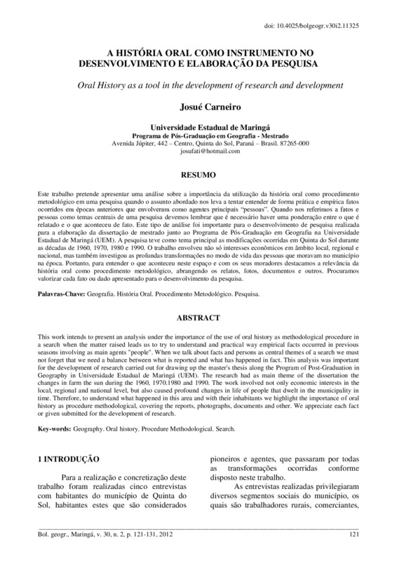 A história oral como instrumento no desenvolvimento e elaboração da pesquisa - doi: 10.4025/bolgeogr.v30i2.11325