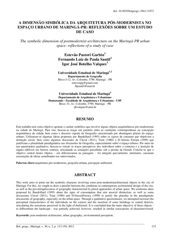 A dimensão simbólica da arquitetura pós-modernista no espaço urbano de Maringá-PR: reflexões sobre um estudo de caso - doi: 10.4025/bolgeogr.v30i2.15473