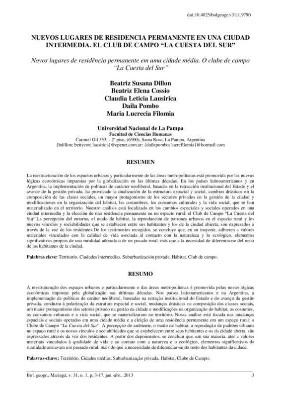 Nuevos lugares de residencia permanente en una ciudad intermedia. El club de campo “La Cuesta del Sur” - doi: 10.4025/bolgeogr.v31i1.9790