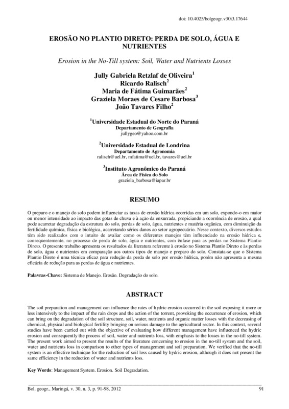 Erosão no plantio direto: perda de solo, água e nutrientes - doi: 10.4025/bolgeogr.v30i3.17644