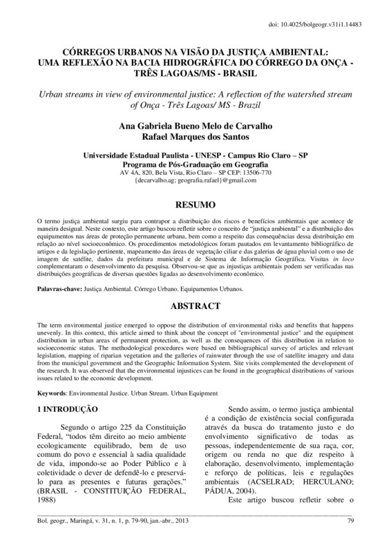 Córregos urbanos na visão da justiça ambiental: Uma reflexão na bacia hidrográfica do córrego da Onça - Três Lagoas/MS - Brasil - doi: 10.4025/bolgeogr.v31i1.14483