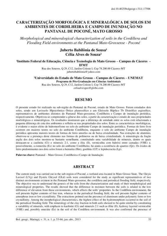 Caracterização morfológica e mineralógica de solos em ambientes de cordilheira e campo de inundação no pantanal de Poconé, Mato Grosso - doi: 10.4025/bolgeogr.v31i1.17506