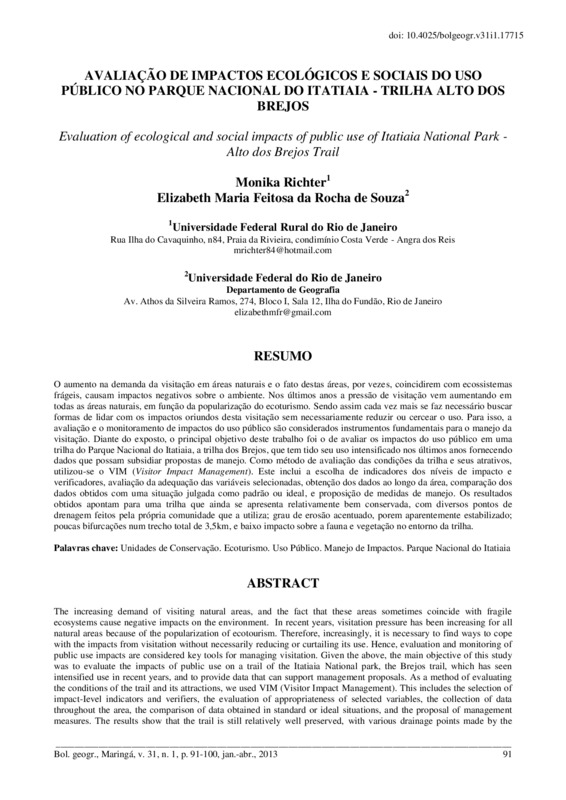 Avaliação de impactos ecológicos e sociais do uso público no Parque Nacional do Itatiaia - Trilha Alto dos Brejos - doi: 10.4025/bolgeogr.v31i1.17715