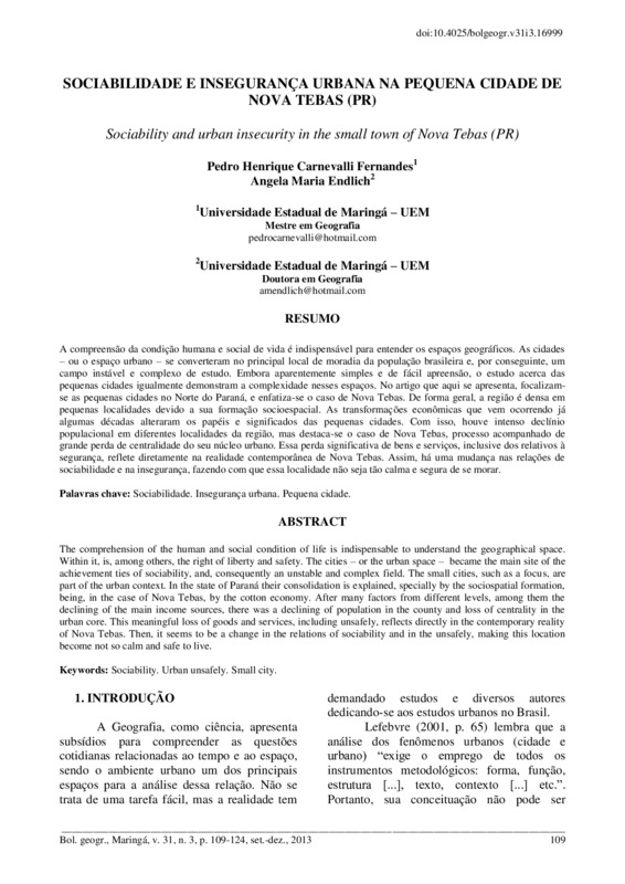 A compreensão da condição humana e social de vida é indispensável para entender os espaços geográficos. Dentro dela, está, entre outros, o direito à liberdade e à segurança. As cidades – ou o espaço urbano – se converteu no principal local de moradia da população brasileira e, por conseguinte, um campo instável e complexo. As pequenas cidades, como recorte desse espaço, fazem parte desse contexto. No Estado do Paraná, a consolidação delas é explicada, especialmente, pela formação socioespacial, sendo, no caso de Nova Tebas, pela economia algodoeira. Após diversos fatores de diferentes escalas, entre eles a decadência dessa principal fonte de renda, houve um intenso declínio populacional no município e uma grande perda de centralidade do núcleo urbano. Essa perda significativa de bens e serviços, inclusive de segurança, reflete diretamente na realidade contemporânea de Nova Tebas. Assim, parece haver uma mudança nas relações de sociabilidade e na insegurança, fazendo com que essa pequena localidade não seja tão calma e segura de se morar.