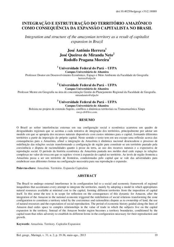 Integração e estruturação do território Amazônico como consequência da expansão capitalista no Brasil - doi: 10.4025/bolgeogr.v31i2.18880