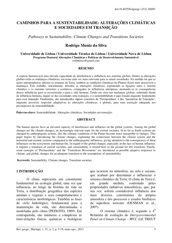Caminhos para a sustentabilidade: alterações climáticas e sociedades em transição - doi: 10.4025/bolgeogr.v31i2.18690
