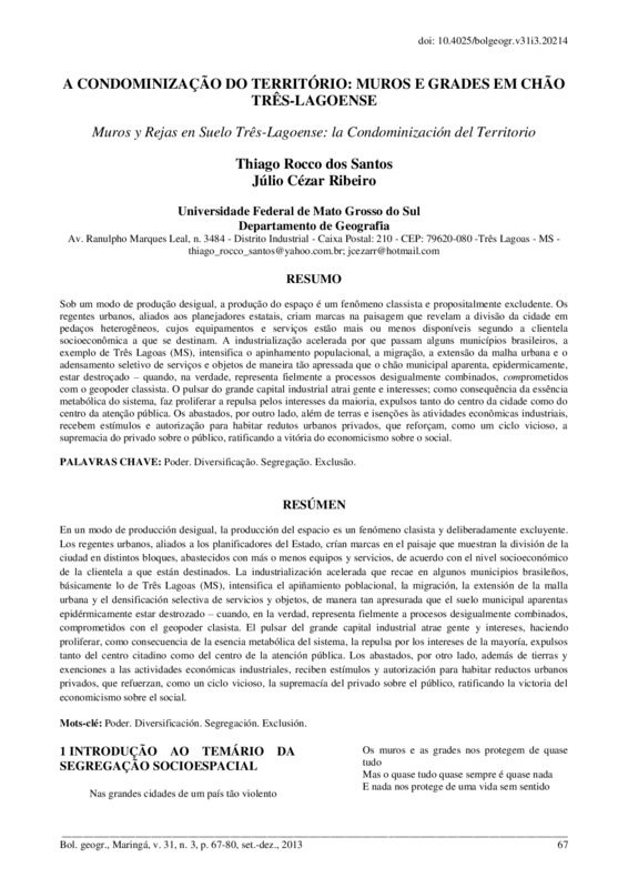 Sob um modo de produção desigual, a produção do espaço é um fenômeno classista propositalmente excludente. Os regentes urbanos, aliados aos planejadores estatais, criam marcas na paisagem que revelam a divisão da cidade em pedaços heterogêneos, munidos de mais ou menos equipamentos e serviços segundo a clientela socioeconômica a que se destinam. A industrialização acelerada que recai em alguns municípios brasileiros – basicamente o de Três Lagoas/MS – intensifica o apinhamento populacional, a migração, a extensão da malha urbana e o adensamento seletivo de serviços e objetos, de maneira tão apressada que o chão municipal aparenta epidermicamente estar destroçado, quando, na verdade, representa fielmente a processos desigualmente combinados, comprometidos com o geopoder classista. O pulsar do grande capital industrial atrai gentes e interesses, fazendo proliferar, como consequência da essência metabólica do sistema, a repulsa pelos interesses da maioria, expulsos tanto do centro citadino como do centro da atenção pública. Os abastados, por outro lado, além de terras e isenções às atividades econômicas industriais, recebem estímulos e autorização para habitar redutos urbanos privados, que reforçam, como um ciclo vicioso, a supremacia do privado sobre o público, ratificando a vitória do economicismo sobre o social.