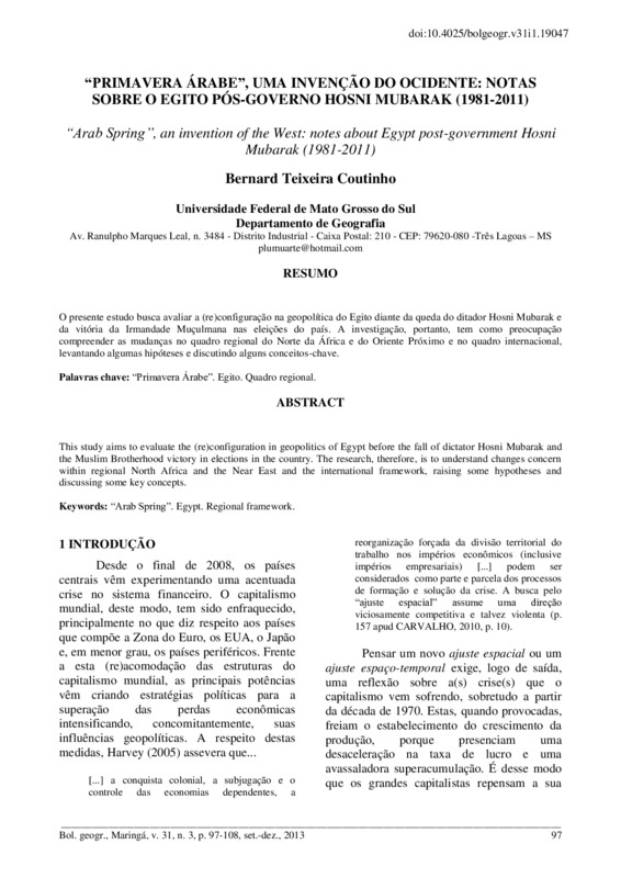 O presente estudo busca avaliar a (re)configuração na geopolítica do Egito diante da queda do ditador Hosni Mubarak e da vitória da Irmandade Muçulmana nas eleições do país. A investigação, portanto, tem como preocupação compreender as mudanças no quadro regional do Norte da África e do Oriente Médio e no quadro internacional, levantando algumas hipóteses e discutindo alguns conceitos-chave.