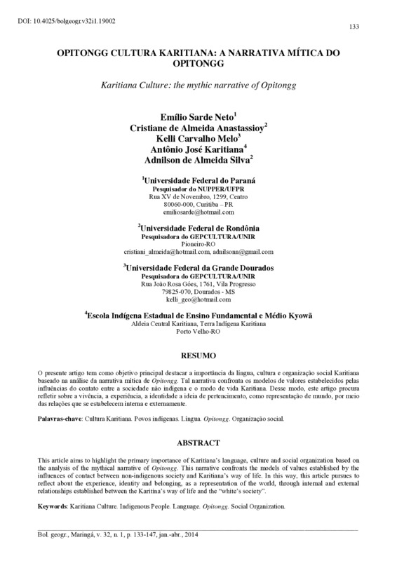 O presente artigo tem como objetivo principal destacar a importância da língua, cultura e organização social Karitiana baseado na análise da narrativa mítica de Opitongg. Tal narrativa confronta os modelos de valores estabelecidos pelas influências do contato entre a sociedade não indígena e o modo de vida Karitiana. Desse modo, este artigo procura refletir sobre a vivência, a experiência, a identidade a ideia de pertencimento, como representação de mundo, por meio das relações que se estabelecem interna e externamente.