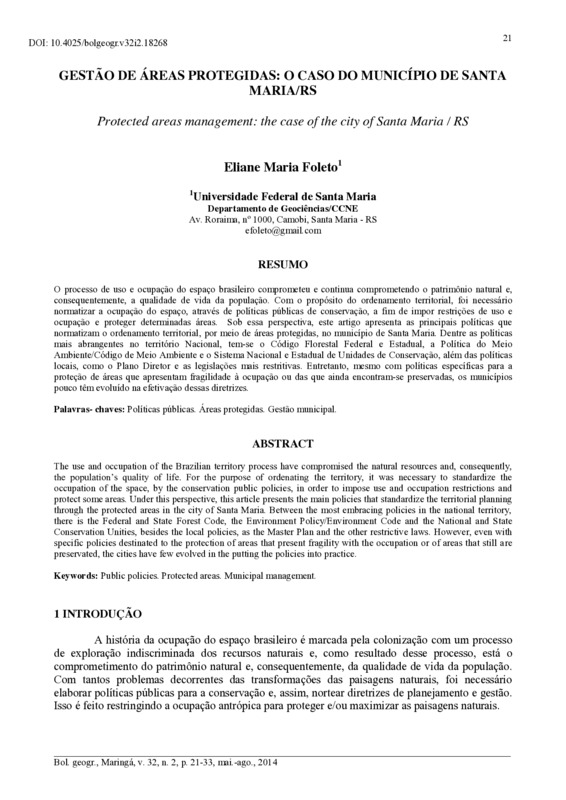 GESTÃO DE ÁREAS PROTEGIDAS: O CASO DO MUNICÍPIO DE SANTA MARIA/RS