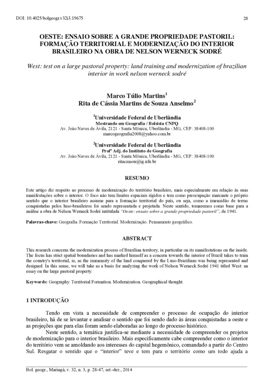 Este artigo diz respeito ao processo de modernização do território brasileiro, mais especialmente em relação às suas manifestações sobre o interior. O foco não tem limites espaciais rígidos e tem como preocupação marcante o próprio sentido que o interior brasileiro assume para a formação territorial do país, ou seja, como a imensidão de terras conquistadas pelos luso-brasileiros foi sendo representada e projetada. Neste sentido, tomaremos como base para a análise a obra de Nelson Werneck Sodré intitulada “Oeste: ensaio sobre a grande propriedade pastoril”, de 1941.
