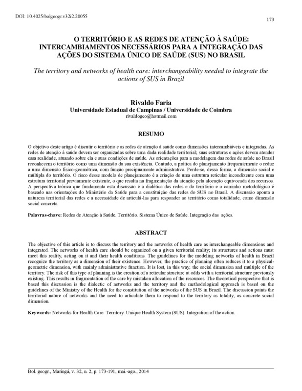 O objetivo deste artigo é discutir o território e as redes de atenção à saúde como dimensões intercambiáveis e integradas. As redes de atenção à saúde devem ser organizadas sobre uma dada realidade territorial; suas estruturas e ações devem atender essa realidade, atuando sobre ela e suas condições de saúde. As orientações para a modelagem das redes de saúde no Brasil reconhecem o território como uma dimensão da sua existência. Contudo, a prática do planejamento frequentemente o reduz a uma dimensão físico-geométrica, com função precipuamente administrativa. Perde-se, dessa forma, a dimensão social e múltipla do território. O risco desse modelo de planejamento é a criação de uma estrutura reticular incondizente com uma estrutura territorial previamente existente, o que resulta na fragmentação da atenção pela alocação equivocada dos recursos. A perspectiva teórica que fundamenta esta discussão é a dialética das redes e do território e o caminho metodológico é baseado nas orientações do Ministério da Saúde para a constituição das redes do SUS no Brasil. A discussão aponta a natureza territorial das redes e a necessidade de articulá-las para responder ao território como totalidade, como dimensão social concreta.