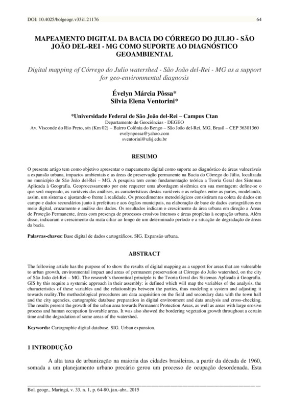 O presente artigo tem como objetivo apresentar o mapeamento digital como suporte ao diagnóstico de áreas vulneráveis a expansão urbana, impactos ambientais e as áreas de preservação permanente na Bacia do Córrego do Júlio, localizada no município de São João del-Rei – MG. A pesquisa tem como fundamentação teórica a Teoria Geral dos Sistemas Aplicada à Geografia. Geoprocessamento por este requerer uma abordagem sistêmica em sua montagem: define-se o que será mapeado, as variáveis das análises, as características destas variáveis e as relações entre as partes, modelando, assim, um sistema e ajustando-o frente à realidade. Os procedimentos metodológicos consistiram na coleta de dados em campo e dados secundários junto à prefeitura e aos órgãos municipais, na elaboração de base de dados cartográficos em meio digital, cruzamento e análise dos dados. Os resultados indicam o crescimento da área urbana em direção a Áreas de Proteção Permanente, áreas com presença de processos erosivos intensos e áreas propícias à ocupação urbana. Além disso, indicaram o crescimento da mata ciliar ao longo de um determinado período e a situação de degradação de áreas da bacia.