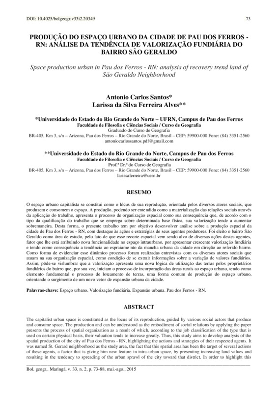 O espaço urbano capitalista se constitui como o lócus de sua reprodução, orientada pelos diversos atores sociais, que produzem e consomem o espaço. A produção, podendo ser entendida como a materialização das relações sociais através da aplicação do trabalho, apresenta o processo de organização espacial como sua consequência que, de acordo com o tipo da qualificação do trabalho que se emprega sobre determinada base física, sua valorização tende a aumentar sobremaneira. Desta forma, o presente trabalho tem por objetivo desenvolver análise sobre a produção espacial da cidade de Pau dos Ferros - RN, com destaque às ações e estratégias de seus agentes produtores. Foi eleito o bairro São Geraldo como área de estudo, pelo fato de que esse recorte espacial vem sendo alvo de diversas ações destes agentes, fator que lhe está atribuindo nova funcionalidade no espaço intraurbano, por apresentar crescente valorização fundiária e tendo como consequência a tendência ao espraiame nto da mancha urbana da cidade em direção ao referido bairro. Como forma de evidenciar esse dinâmico processo foram realizadas entrevistas com os diversos atores sociais que atuam na sua organização espacial, como condição de se extrair informações sobre a variação de valores fundiários. Assim, pôde-se vislumbrar que a valorização apresenta uma nova lógica de utilização das terras pelos proprietários fundiários do bairro que, por sua vez, iniciam o processo de incorporação das áreas rurais ao espaço urbano, tendo como elemento fundamental o processo de loteamento de terras, uma forma comum de produção do espaço urbano, orientando o surgimento de um novo vetor de expansão urbana da cidade.