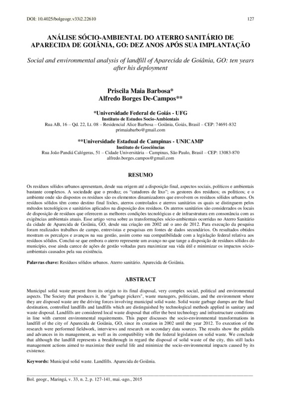 Os resíduos sólidos urbanos apresentam, desde sua origem até a disposição final, aspectos sociais, políticos e ambientais bastante complexos. A sociedade que o produz; os “catadores de lixo”; os gestores dos resíduos; os políticos; e o ambiente onde são dispostos os resíduos são os elementos dinamizadores que envolvem os resíduos sólidos urbanos. Os resíduos sólidos têm como destino final lixões, aterros controlados e aterros sanitários os quais se distinguem pelos métodos tecnológicos e sanitários aplicados na disposição dos resíduos. Os aterros sanitários são considerados os locais de disposição de resíduos que oferecem as melhores condições tecnológicas e de infraestrutura em consonância com as exigências ambientais atuais. Esse artigo versa sobre as transformações sócio-ambientais ocorridas no Aterro Sanitário da cidade de Aparecida de Goiânia, GO, desde sua criação em 2002 até o ano de 2012. Para execução da pesquisa foram realizados trabalhos de campo, entrevistas e pesquisas em fontes de dados secundários. Os resultados obtidos mostram os percalços e avanços na sua gestão, assim como sua compatibilidade com a legislação federal relativa aos resíduos sólidos. Conclui-se que embora o aterro represente um avanço no que tange a disposição de resíduos sólidos do município, esse ainda carece de ações de gestão voltadas para maximizar sua vida útil e minimizar os impactos sócio-ambientais causados pela sua existência.