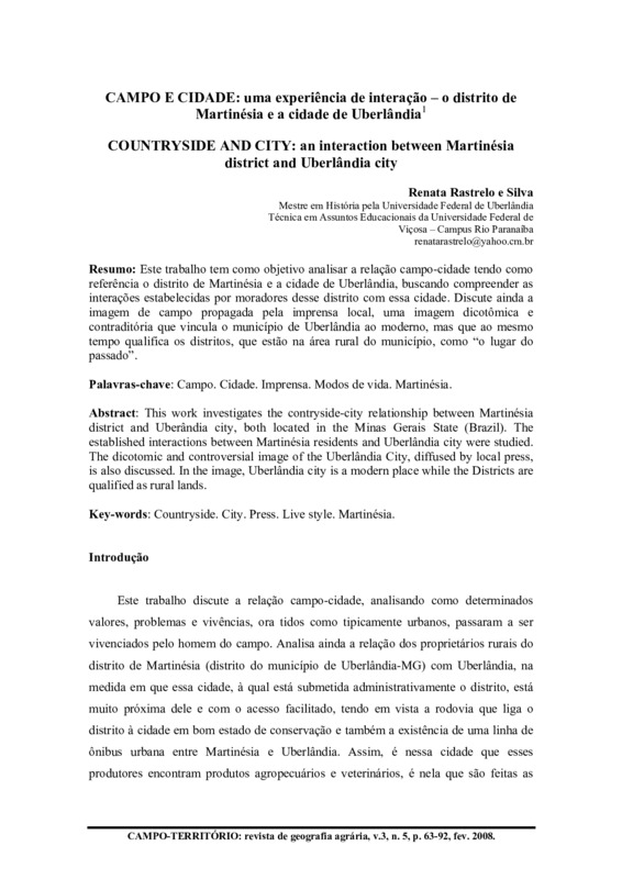 Este trabalho tem como objetivo analisar a relação campo-cidade tendo como referência o distrito de Martinésia e a cidade de Uberlândia, buscando compreender as interações estabelecidas por moradores desse distrito com essa cidade. Discute ainda a imagem de campo propagada pela imprensa local, uma imagem dicotômica e contraditória que vincula o município de Uberlândia ao moderno, mas que ao mesmo tempo qualifica os distritos, que estão na área rural do município, como “o lugar do passado.