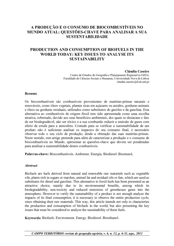 A PRODUÇÃO E O CONSUMO DE BIOCOMBUSTÍVEIS NO MUNDO ACTUAL: QUESTÕES-CHAVE PARA ANALISAR A SUA SUSTENTABILIDADE / PRODUCTION AND CONSUMPTION OF BIOFUELS IN THE WORLD TODAY: KEY ISSUES TO ANALYSE ITS SUSTAINABILITY