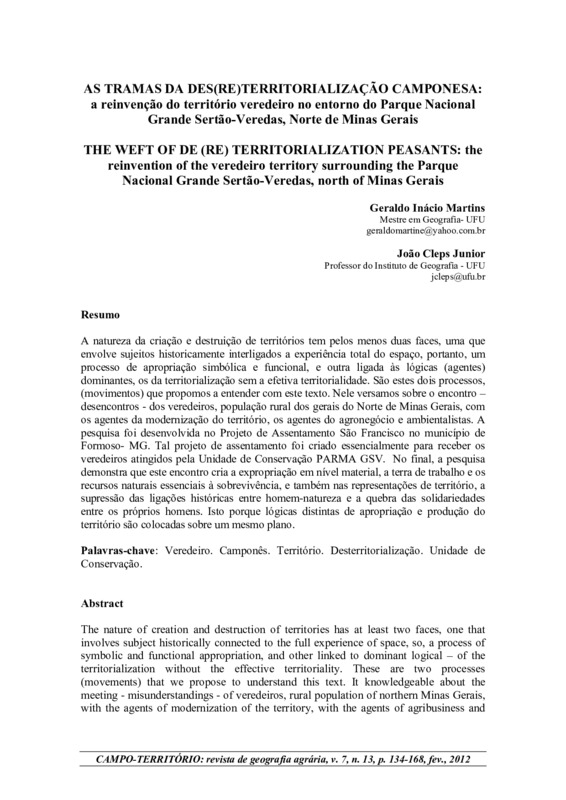 A natureza da criação e destruição de territórios tem pelos menos duas faces, uma que envolve sujeitos historicamente interligados a experiência total do espaço, portanto, um processo de apropriação simbólica e funcional, e outra ligada às lógicas (agentes) dominantes, os da territorialização sem a efetiva territorialidade. São estes dois processos, (movimentos) que propomos a entender com este texto. Nele versamos sobre o encontro – desencontros - dos veredeiros, população rural dos gerais do Norte de Minas Gerais, com os agentes da modernização do território, os agentes do agronegócio e ambientalistas. A pesquisa foi desenvolvida no Projeto de Assentamento São Francisco no município de Formoso- MG. Tal projeto de assentamento foi criado essencialmente para receber os veredeiros atingidos pela Unidade de Conservação PARMA GSV. No final, a pesquisa demonstra que este encontro cria a expropriação em nível material, a terra de trabalho e os recursos naturais essenciais à sobrevivência, e também nas representações de território, a supressão das ligações históricas entre homem-natureza e a quebra das solidariedades entre os próprios homens. Isto porque lógicas distintas de apropriação e produção do território são colocadas sobre um mesmo plano.