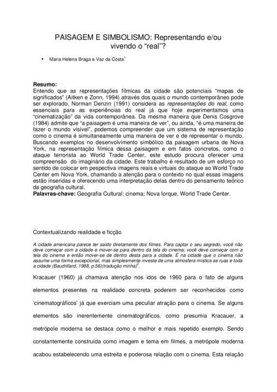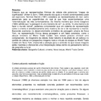 Resumo: Entendo que as representações fílmicas da cidade são potenciais “mapas de significados” (Aitken e Zonn, 1994) através dos quais o mundo contemporâneo pode ser explorado, Norman Denzin (1991) considera as representações do real, como essenciais para as experiências do real já que hoje experimentamos uma “cinematização” da vida contemporânea. Da mesma maneira que Denis Cosgrove (1984) admite que “a paisagem é uma maneira de ver”, ou ainda, “é uma maneira de fazer o mundo visível”, podemos compreender que um sistema de representação como o cinema é simultaneamente uma maneira de ver e de representar o mundo. Buscando exemplos no desenvolvimento simbólico da paisagem urbana de Nova York, na representação filmica dessa paisagem e em fatos concretos, como o ataque terrorista ao World Trade Center, este estudo procura oferecer uma compreensão do imaginário da cidade. Este trabalho é resultado de um esforço no sentido de colocar em pespectiva imagens reais e virtuais do ataque ao World Trade Center em Nova York, chamando a atenção para o contexto no qual essas imagens estão inseridas e oferecendo uma interpretação delas dentro do pensamento teórico da geografia cultural.