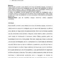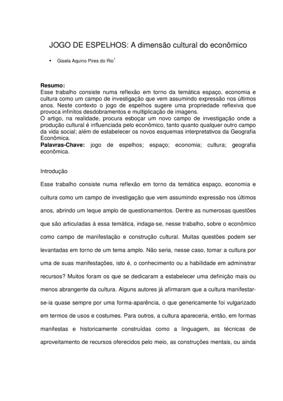 Resumo: Esse trabalho consiste numa reflexão em torno da temática espaço, economia e cultura como um campo de investigação que vem assumindo expressão nos últimos anos. Neste contexto o jogo de espelhos sugere uma propriedade reflexiva que provoca infinitos desdobramentos e multiplicação de imagens. O artigo, na realidade, procura esboçar um novo campo de investigação onde a produção cultural é influenciada pelo econômico, tanto quanto qualquer outro campo da vida social; além de estabelecer os novos esquemas interpretativos da Geografia Econômica.