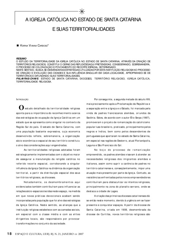 A IGREJA CATÓLICA NO ESTADO DE SANTA CATARINA E SUAS TERRITORIALIDADES