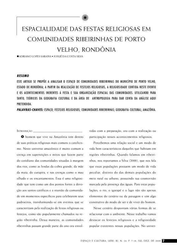 ESPACIALIDADE DAS FESTAS RELIGIOSAS EM COMUNIDADES RIBEIRINHAS DE PORTO VELHO, RONDÔNIA