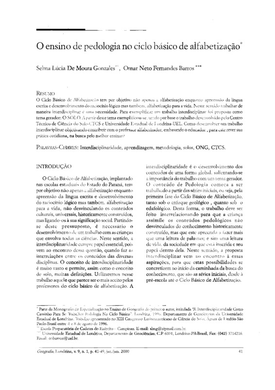 O Ciclo Básico de Alfabetização tem por objetivo não apenas a alfabetização enquanto apreensão da língua escrita e desenvolvimento do raciocínio lógico mas também, alfabetização para a vida. Neste sentido trabalhar de maneira interdisciplinar é uma necessidade. Para exemplificar um trabalho interdisciplinar foi proposto como tema gerador: O SOLO. A partir deste tema exemplificou-se, tendo por base o trabalho desenvolvido pelo Centro Técnico de Ciência do Solo-CTCS e Universidade Estadual de Londrina-UEL. Como desenvolver um trabalho interdisciplinar objetivando contribuir com o professor alfabetizador, embasando o educador, para este rever sua prática cotidiana, na busca pelo melhor ensinar?