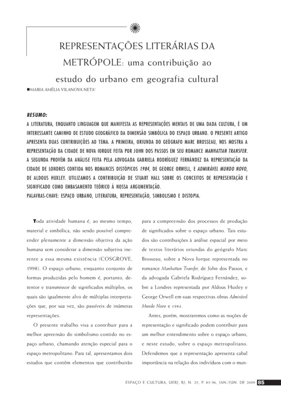 REPRESENTAÇÕES LITERÁRIAS DA METRÓPOLE: uma contribuição ao estudo do urbano em geografia cultural