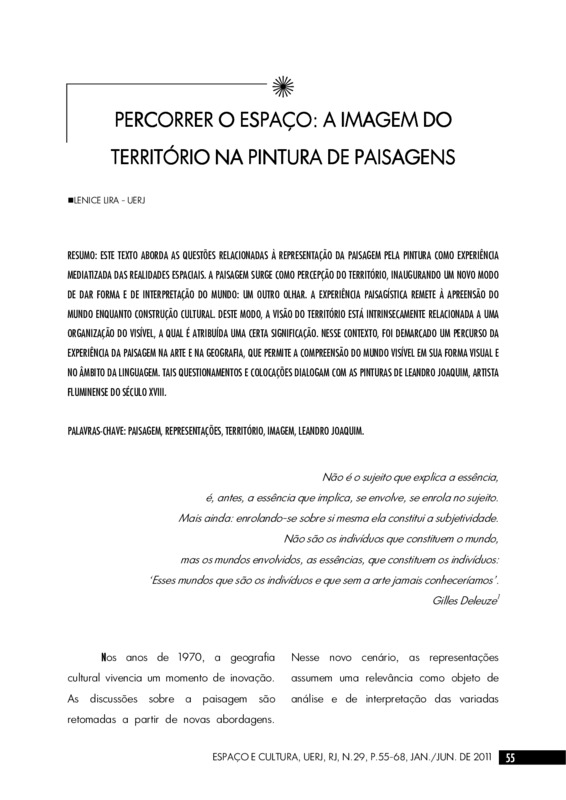 ESTE TEXTO ABORDA AS QUESTÕES RELACIONADAS À REPRESENTAÇÃO DA PAISAGEM PELA PINTURA COMO EXPERIÊNCIA MEDIATIZADA DAS REALIDADES ESPACIAIS. A PAISAGEM SURGE COMO PERCEPÇÃO DO TERRITÓRIO, INAUGURANDO UM NOVO MODO DE DAR FORMA E DE INTERPRETAÇÃO DO MUNDO: UM OUTRO OLHAR. A EXPERIÊNCIA PAISAGÍSTICA REMETE À APREENSÃO DO MUNDO ENQUANTO CONSTRUÇÃO CULTURAL. DESTE MODO, A VISÃO DO TERRITÓRIO ESTÁ INTRINSECAMENTE RELACIONADA A UMA ORGANIZAÇÃO DO VISÍVEL, A QUAL É ATRIBUÍDA UMA CERTA SIGNIFICAÇÃO. NESSE CONTEXTO, FOI DEMARCADO UM PERCURSO DA EXPERIÊNCIA DA PAISAGEM NA ARTE E NA GEOGRAFIA, QUE PERMITE A COMPREENSÃO DO MUNDO VISÍVEL EM SUA FORMA VISUAL E NO ÂMBITO DA LINGUAGEM. TAIS QUESTIONAMENTOS E COLOCAÇÕES DIALOGAM COM AS PINTURAS DE LEANDRO JOAQUIM, ARTISTA FLUMINENSE DO SÉCULO XVIII.