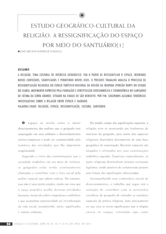 - ESTUDO GEOGRÁFICO-CULTURAL DA RELIGIÃO: A RESSIGNIFICAÇÃO DO ESPAÇO POR MEIO DO SANTUÁRIO