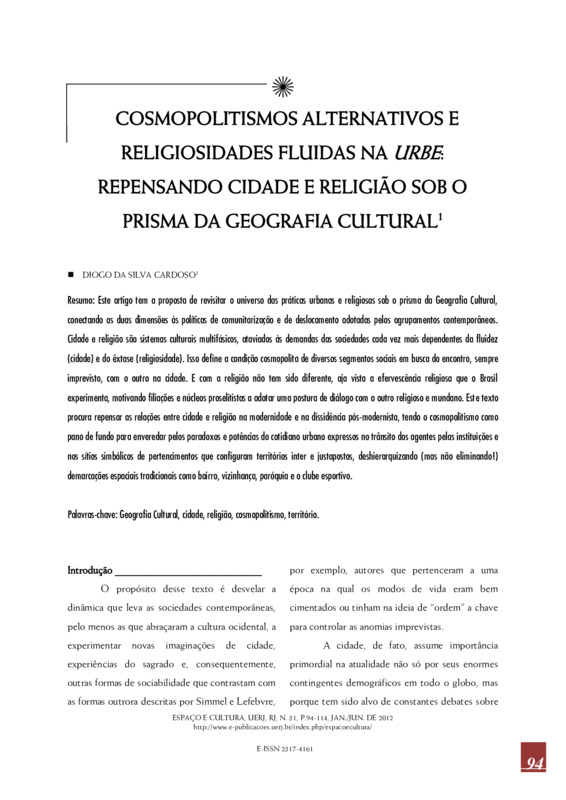 Este artigo tem a proposta de revisitar o universo das práticas urbanas e religiosas sob o prisma da Geografia Cultural, conectando as duas dimensões às políticas de comunitarização e de deslocamento adotadas pelos agrupamentos contemporâneos. Cidade e religião são sistemas culturais multifásicos, ataviados às demandas das sociedades cada vez mais dependentes da fluidez (cidade) e do êxtase (religiosidade). Isso define a condição cosmopolita de diversos segmentos sociais em busca do encontro, sempre imprevisto, com o outro na cidade. E com a religião não tem sido diferente, aja vista a efervescência religiosa que o Brasil experimenta, motivando filiações e núcleos proselitistas a adotar uma postura de diálogo com o outro religioso e mundano. Este texto procura repensar as relações entre cidade e religião na modernidade e na dissidência pós-modernista, tendo o cosmopolitismo como pano de fundo para enveredar pelos paradoxos e potências do cotidiano urbano expressos no trânsito dos agentes pelas instituições e nos sítios simbólicos de pertencimentos que configuram territórios inter e justapostos, deshierarquizando (mas não eliminando!) demarcações espaciais tradicionais como bairro, vizinhança, paróquia e o clube esportivo.