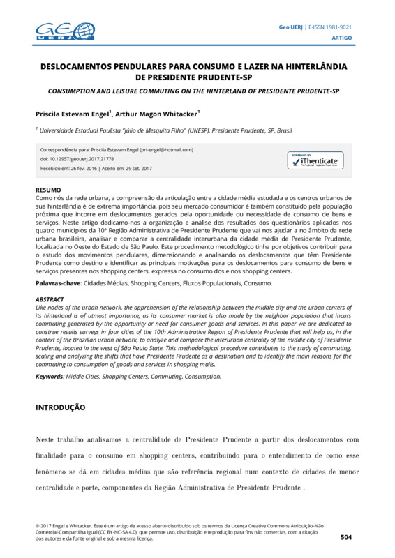 doi: 10.12957/geouerj.2017.21778Como nós da rede urbana, a compreensão da articulação entre a cidade média estudada e os centros urbanos de sua hinterlândia é de extrema importância, pois seu mercado consumidor é também constituído pela população próxima que incorre em deslocamentos gerados pela oportunidade ou necessidade de consumo de bens e serviços. Neste artigo dedicamo-nos a organização e análise dos resultados dos questionários aplicados nos quatro municípios da 10ª Região Administrativa de Presidente Prudente que vai nos ajudar a no âmbito da rede urbana brasileira, analisar e comparar a centralidade interurbana da cidade média de Presidente Prudente, localizada no Oeste do Estado de São Paulo. Este procedimento metodológico tinha por objetivos contribuir para o estudo dos movimentos pendulares, dimensionando e analisando os deslocamentos que têm Presidente Prudente como destino e identificar as principais motivações para os deslocamentos para consumo de bens e serviços presentes nos shopping centers, expressa no consumo dos e nos shopping centers.