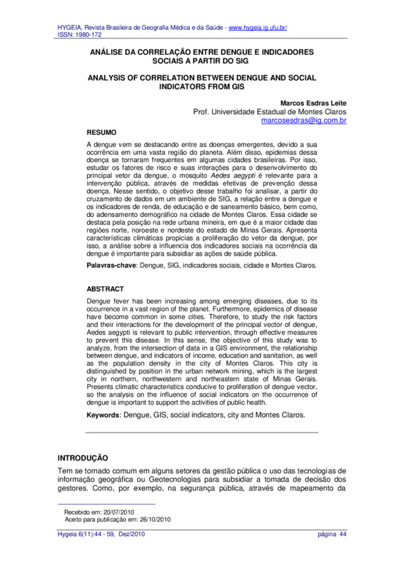 ANÁLISE DA CORRELAÇÃO ENTRE DENGUE E INDICADORES SOCIAIS A PARTIR DO SIG - ANALYSIS OF CORRELATION BETWEEN DENGUE AND SOCIAL INDICATORS FROM GIS