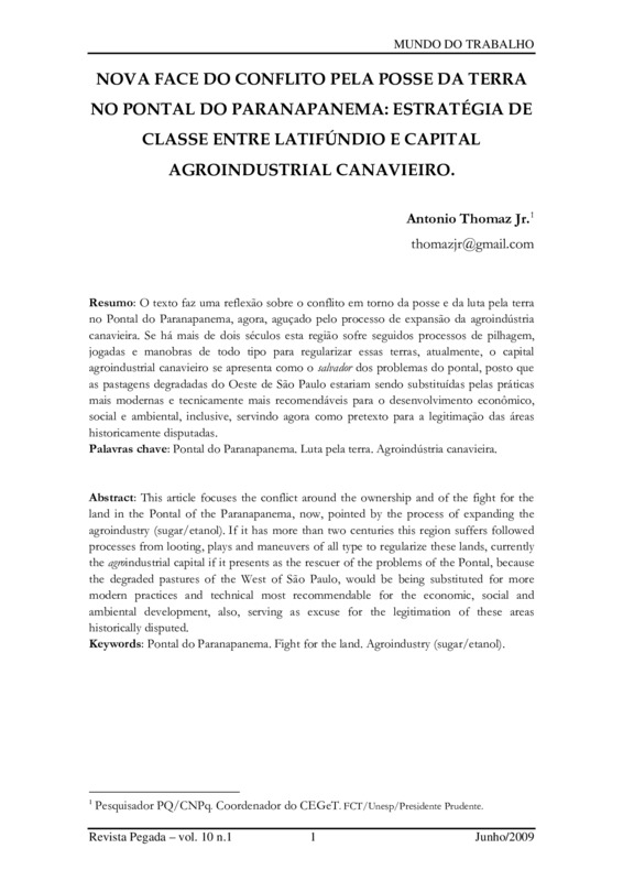 NOVA FACE DO CONFLITO PELA POSSE DA TERRA NO PONTAL DO PARANAPANEMA: ESTRATÉGIA DE CLASSE ENTRE LATIFÚNDIO E CAPITAL AGROINDUSTRIAL CANAVIEIRO