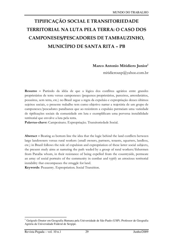 TIPIFICAÇÃO SOCIAL E TRANSITORIEDADE TERRITORIAL NA LUTA PELA TERRA: O CASO DOS CAMPONESES/PESCADORES DE TAMBAUZINHO, MUNICÍPIO DE SANTA RITA – PB
