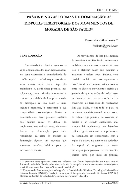 PRÁXIS E NOVAS FORMAS DE DOMINAÇÃO: AS DISPUTAS TERRITORIAIS DOS MOVIMENTOS DE MORADIA DE SÃO PAULO