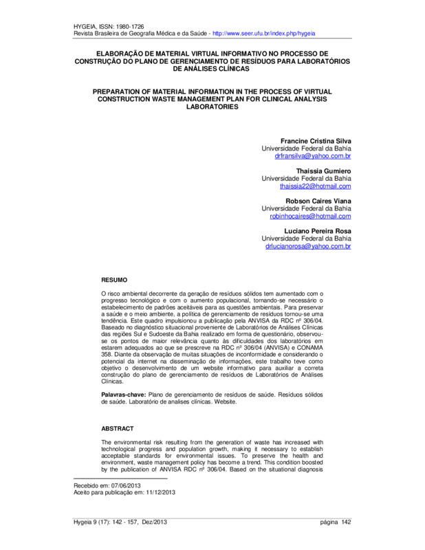 O risco ambiental decorrente da geração de resíduos sólidos tem aumentado com o progresso tecnológico e com o aumento populacional, tornando-se necessário o estabelecimento de padrões aceitáveis para as questões ambientais. Para preservar a saúde e o meio ambiente, a política de gerenciamento de resíduos tornou-se uma tendência. Este quadro impulsionou a publicação pela ANVISA da RDC nº 306/04. Baseado no diagnóstico situacional proveniente de Laboratórios de Análises Clínicas das regiões Sul e Sudoeste da Bahia realizado em forma de questionário, observou-se os pontos de maior relevância quanto às dificuldades dos laboratórios em estarem adequados ao que se prescreve na RDC nº 306/04 (ANVISA) e CONAMA 358. Diante da observação de muitas situações de inconformidade e considerando o potencial da internet na disseminação de informações, este trabalho teve como objetivo o desenvolvimento de um website informativo para auxiliar a correta construção do plano de gerenciamento de resíduos de Laboratórios de Análises Clínicas.