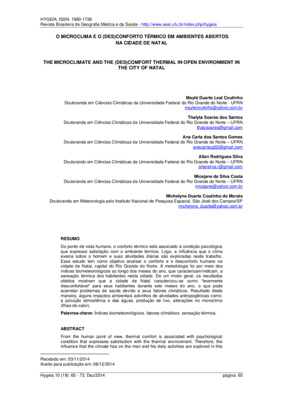 Do ponto de vista humano, o conforto térmico está associado à condição psicológica que expresse satisfação com o ambiente térmico. Logo, a influência que o clima exerce sobre o homem e suas atividades diárias são exploradas neste trabalho. Esse estudo tem como objetivo analisar o conforto e o desconforto humano na cidade de Natal, capital do Rio Grande do Norte. A metodologia foi por meio dos índices biometeorológicos ao longo dos meses do ano, que caracterizam/indicam, a sensação térmica dos habitantes nesta cidade. De um modo geral, os resultados obtidos mostram que a cidade de Natal caracterizou-se como “levemente desconfortável” para seus habitantes durante seis meses do ano, o que pode acarretar problemas de saúde devido a seus fatores climáticos. Resultado desta maneira, alguns impactos ambientais advinhos de atividades antropogênicas como: a poluição atmosférica e das águas, produção de lixo, alterações no microclima (Ilhas de calor).
