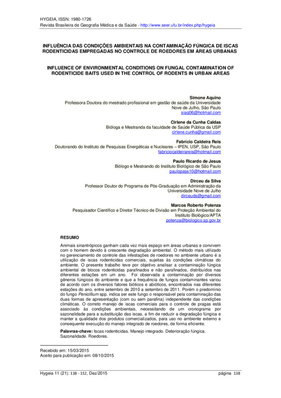 Animais sinantrópicos ganham cada vez mais espaço em áreas urbanas e convivem com o homem devido à crescente degradação ambiental. O método mais utilizado no gerenciamento de controle das infestações de roedores no ambiente urbano é a utilização de iscas rodenticidas comerciais, sujeitas às condições climáticas do ambiente. O presente trabalho teve por objetivo analisar a contaminação fúngica ambiental de blocos rodenticidas parafinados e não parafinados, distribuídos nas diferentes estações em um ano.  Foi observada a contaminação por diversos gêneros fúngicos do ambiente e que a frequência de fungos contaminantes variou de acordo com os diversos fatores bióticos e abióticos, encontrados nas diferentes estações do ano, entre setembro de 2010 a setembro de 2011. Porém o predomínio do fungo Penicillium spp. indica ser este fungo o responsável pela contaminação das duas formas de apresentação (com ou sem parafina) independente das condições climáticas. O correto manejo de iscas comerciais para o controle de pragas está associado às condições ambientais, necessitando de um cronograma por sazonalidade para a substituição das iscas, a fim de reduzir a degradação fúngica e manter a qualidade dos produtos comercializados, para uso no ambiente externo e consequente execução do manejo integrado de roedores, de forma eficiente.