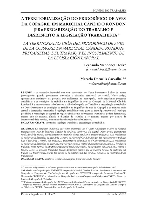 A TERRITORIALIZAÇÃO DO FRIGORÍFICO DE AVES DA COPAGRIL EM MARECHAL CÂNDIDO RONDON (PR): PRECARIZAÇÃO DO TRABALHO E DESRESPEITO À LEGISLAÇÃO TRABALHISTA