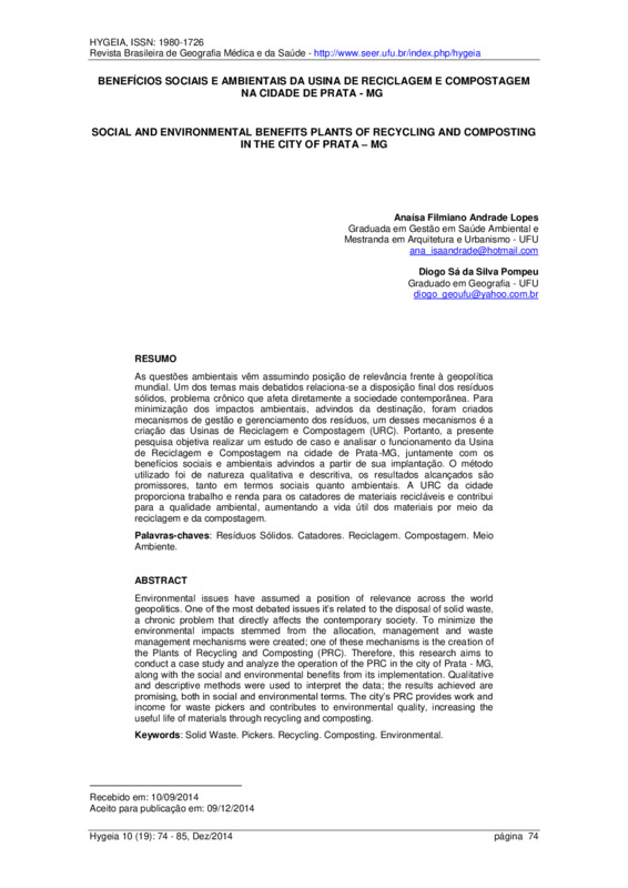As questões ambientais vêm assumindo posição de relevância frente à geopolítica mundial. Um dos temas mais debatidos relaciona-se a disposição final dos resíduos sólidos, problema crônico que afeta diretamente a sociedade contemporânea. Para minimização dos impactos ambientais, advindos da destinação, foram criados mecanismos de gestão e gerenciamento dos resíduos, um desses mecanismos é a criação das Usinas de Reciclagem e Compostagem (URC). Portanto, a presente pesquisa objetiva realizar um estudo de caso e analisar o funcionamento da Usina de Reciclagem e Compostagem na cidade de Prata-MG, juntamente com os benefícios sociais e ambientais advindos a partir de sua implantação. O método utilizado foi de natureza qualitativa e descritiva, os resultados alcançados são promissores, tanto em termos sociais quanto ambientais. A URC da cidade proporciona trabalho e renda para os catadores de materiais recicláveis e contribui para a qualidade ambiental, aumentando a vida útil dos materiais por meio da reciclagem e da compostagem.