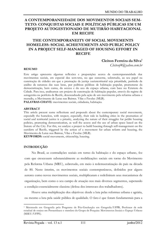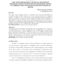 Este artigo apresenta algumas reflexões e proposições acerca da contemporaneidade dos movimentos sociais, em especial dos sem-teto, no que concerne, sobretudo, ao seu papel na construção de cidades em que a promoção da justiça socioterritorial seja prioridade, partindo da análise da natureza das suas lutas, por políticas públicas de habitação popular, promotoras da democratização, bem como, do acesso e do uso do espaço urbano, com base no Estatuto da Cidade. Para isso, analisamos um projeto de construção de habitação popular, através do regime de autogestão na periferia de Recife, desencadeado pela ação de um movimento pela reforma urbana e moradia, o Movimento de Lutas nos Bairros. Vilas e Favelas (MLB).