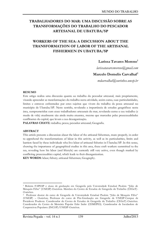 Este artigo realiza uma discussão quanto ao trabalho do pescador artesanal, mais propriamente, visando apreender as transformações do trabalho nesta atividade, assim como, suas particularidades, limites e entraves enfrentados por estes sujeitos que vivem do trabalho da pesca artesanal no município de Ubatuba/SP. Neste sentido, revelando a importância de estudos geográficos nesta área, comprometidos com esses trabalhadores artesanais do mar, revelando como o seu trabalho (e modo de vida) atualmente são ainda muito atuantes, mesmo que marcados pelas processualidades conflitantes do capital, que levam a sua desorganização.