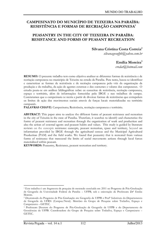 RESUMO: O presente trabalho tem como objetivo analisar as diferentes formas de resistência e de recriação camponesa no município de Teixeira na Paraíba. Para tanto, busca-se identificar e caracterizar as formas de resistência e de recriação camponesa pelo viés da organização da produção e do trabalho, da ação de agentes externos e dos costumes e valores dos camponeses. O estudo pauta-se em análises bibliográficas sobre os conceitos de resistência, recriação camponesa, espaço e território, além de informações fornecidas pelo IBGE e nos trabalhos de campo. Constatamos que o campesinato se recria a partir de diversas formas de resistências que extrapolam os limites de ação dos movimentos sociais através de forças locais materializadas no território camponês.