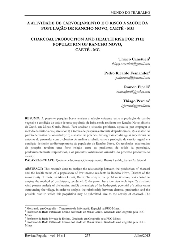 A presente pesquisa busca analisar a relação existente entre a produção de carvão vegetal e a condição de saúde de uma população de baixa renda residente em Rancho Novo, distrito de Caeté, em Minas Gerais, Brasil. Para analisar a situação problema, optou-se por empregar o método da história oral, atrelado: 1) à técnica de pesquisa-entrevista despadronizada; 2) à análise rítmica climatológica; e 3) à análise do potencial hidrogeniônico das águas superficiais do entorno do povoado, com o objetivo de corroborar os possíveis riscos aos quais esta população pode estar submetida, devido à atividade carvoeira. Os resultados encontrados da pesquisa revelam uma forte relação entre os problemas de saúde da população, predominantemente respiratórios, e os produtos volatilizados oriundos do processo produtivo do carvão.