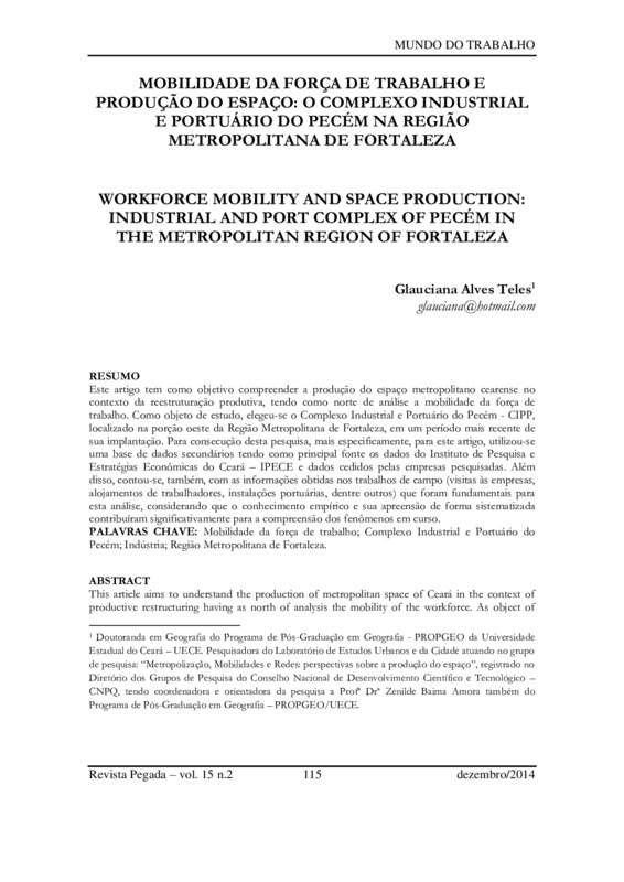 Este artigo tem como objetivo compreender a produção do espaço metropolitano cearense no contexto da reestruturação produtiva, tendo como norte de análise a mobilidade da força de trabalho. Como objeto de estudo, elegeu-se o Complexo Industrial e Portuário do Pecém - CIPP, localizado na porção oeste da Região Metropolitana de Fortaleza, em um período mais recente de sua implantação. Para consecução desta pesquisa, mais especificamente, para este artigo, utilizou-se uma base de dados secundários tendo como principal fonte os dados do Instituto de Pesquisa e Estratégias Econômicas do Ceará – IPECE e dados cedidos pelas empresas pesquisadas. Além disso, contou-se, também, com as informações obtidas nos trabalhos de campo (visitas às empresas, alojamentos de trabalhadores, instalações portuárias, dentre outros) que foram fundamentais para esta análise, considerando que o conhecimento empírico e sua apreensão de forma sistematizada contribuíram significativamente para a compreensão dos fenômenos em curso.